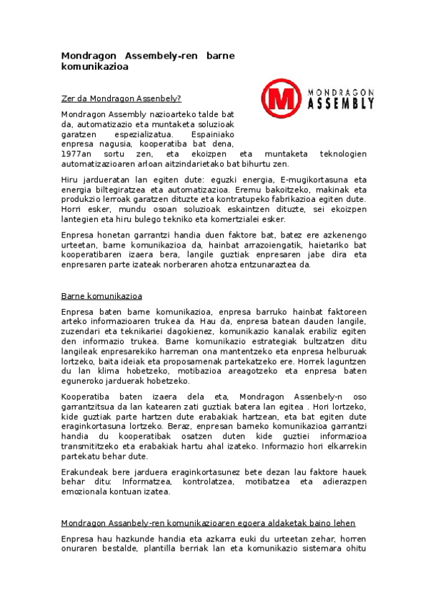 He publicado nuevos trabajos de 1º Economía de la Empresa: Organización y Dirección: Mondragon-Assembely-barne-komunikazioa.docx