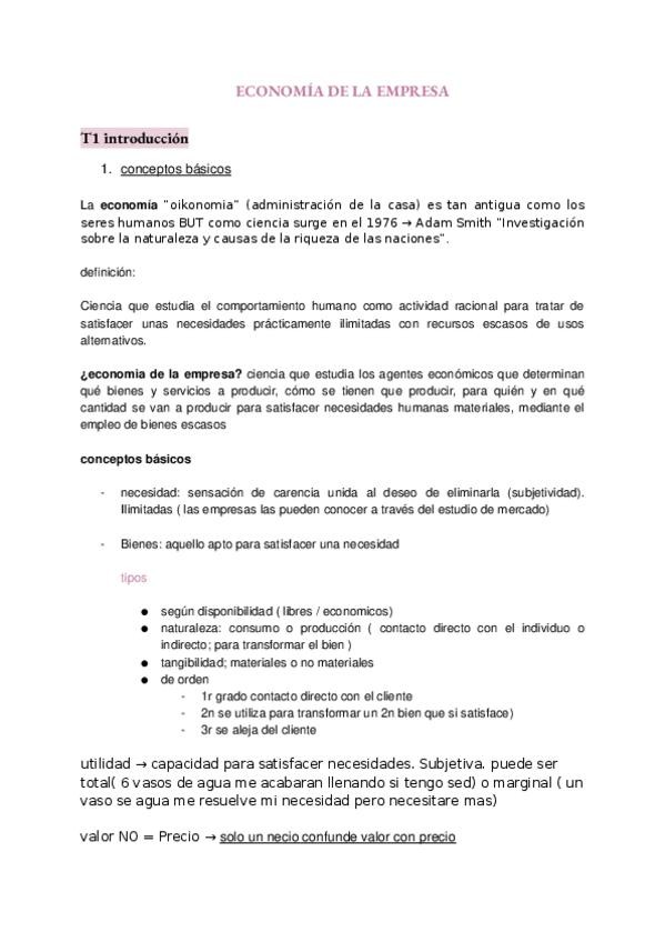Apuntes de Tema 1: Introducción - Economía de la Empresa (1r cuatrimestre, 1º de ADE)