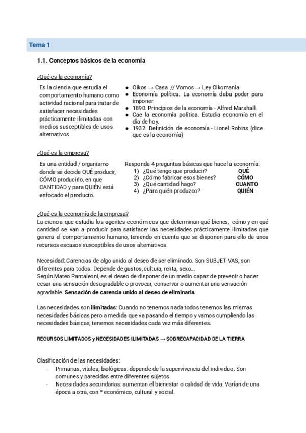 Resumen simple y completo de los 5 primeros temas de Economía de la Empresa perfecto para estudiar el Parcial de primer año