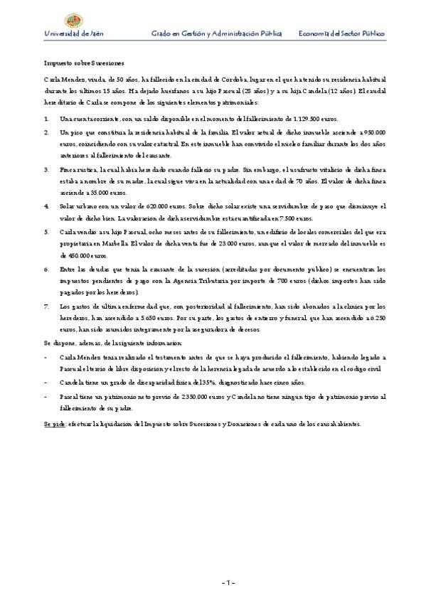 Este PDF contiene ejercicios de examen planteado por la profesora para enfrentarnos a sucesos para poder resolverlos con lo aprendido en la Ley de Sucesiones y Donaciones
