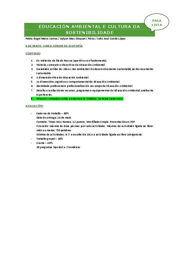 He publicado nuevos apuntes de 2º Educación Ambiental y Cultura de la Sostenibilidad: Educación Ambiental e Cultura da Sustentabilidade. Apuntes Traballo grupo de transición