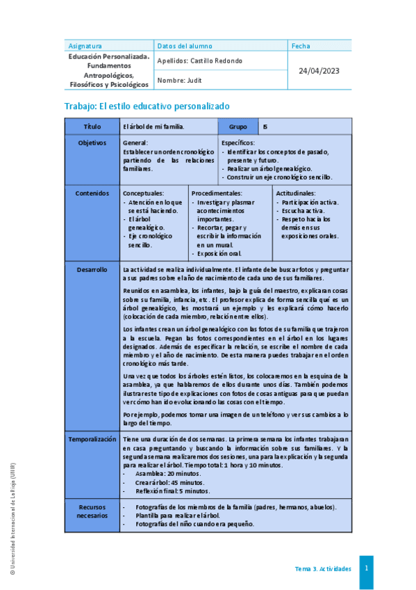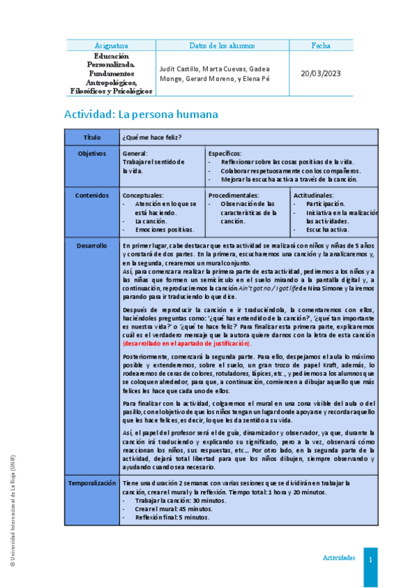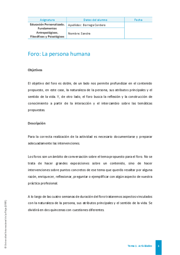 Asignatura: Educación Personalizada. Fundamentos Antropológicos, Filosóficos y Psicológicos. (NOTA 8). Primer curso, Segundo cuatrimestre. Actividad 1. (Abril 2025)