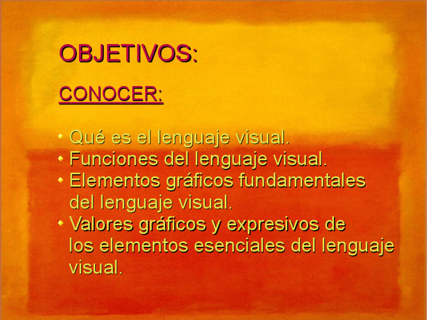 OBJETIVOS: Qué es el lenguaje visual. Funciones del lenguaje visual. Elementos gráficos fundamentales del lenguaje visual. Valores gráficos y expresivos de los elementos esenciales del lenguaje visual.