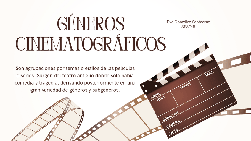 El trabajo consistía en realizar una presentación indicando cinco ejemplos de cada uno de los géneros cinematográficos estudiados en clase. En este trabajo fui valorada con un 10.