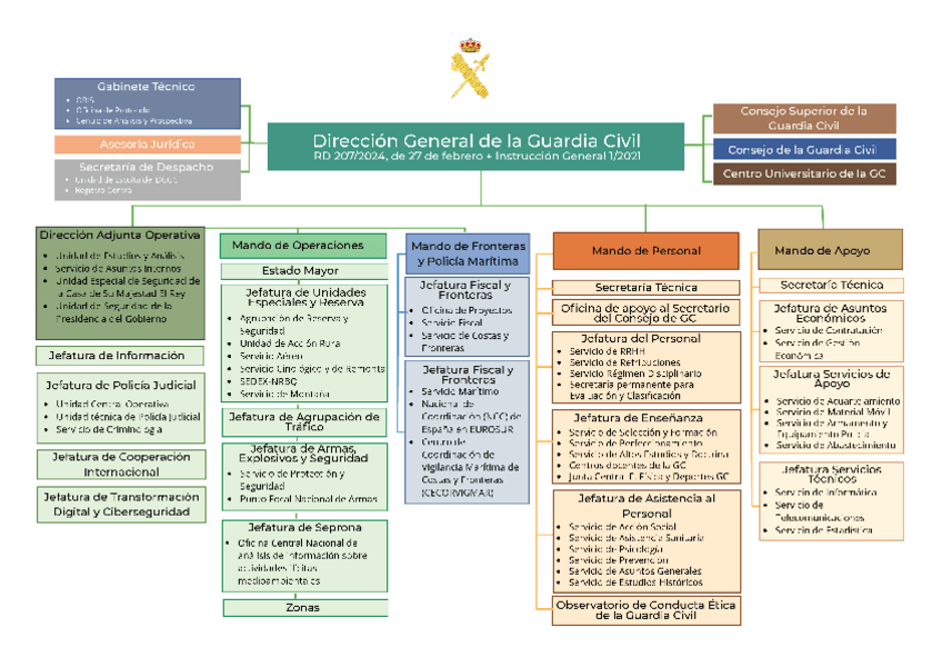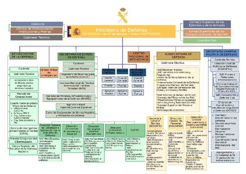 ORGANIGRAMA QUE INCLUYE EL MINISTERIO DE DEFENSA Y EL MINISTERIO DE INTERIOR. INFORMACIÓN SACADA DEL TEMA 14 DE LA PREPARACIÓN A LA OPOSICIÓN DE GUARDIA CIVIL. RD 207/2024 Y RD 205/2024
