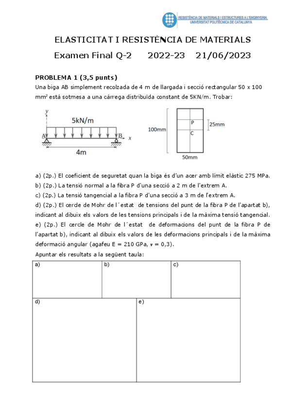He publicado nuevos examenes de 2º Elasticitat i Resistència dels Materials: Examen-final-2021-2022-elrm-resuelto.pdf