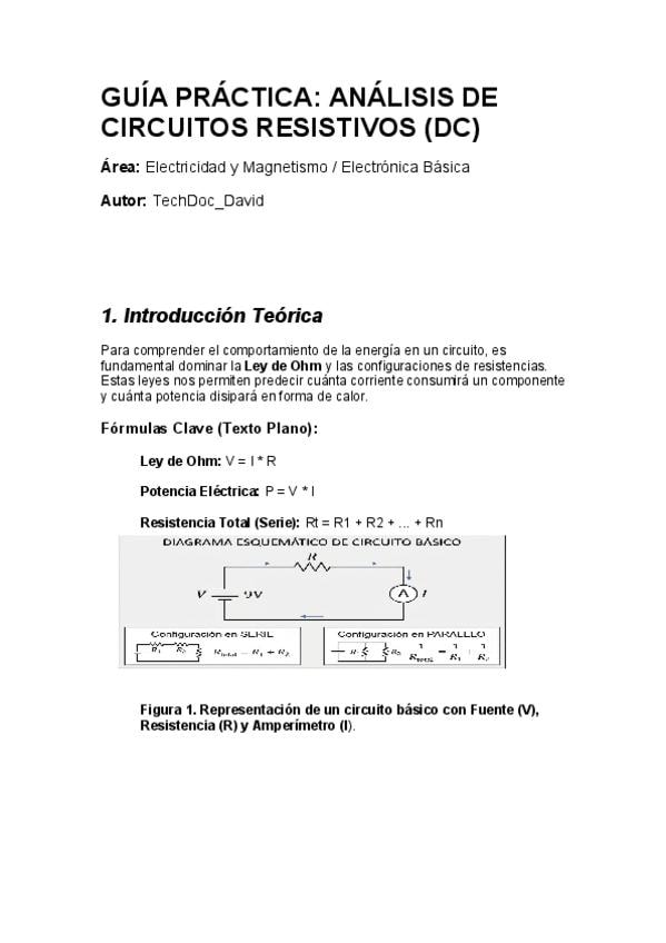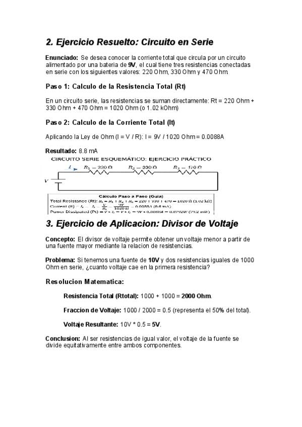 Documento con ejercicios resueltos paso a paso sobre circuitos en serie. Incluye calculo de resistencia total (1020 Ohm), corriente (8.8 mA) y aplicacion de divisor de voltaje. Contiene diagramas claros de fuentes y resistencias para facilitar el estudio.