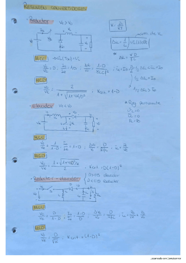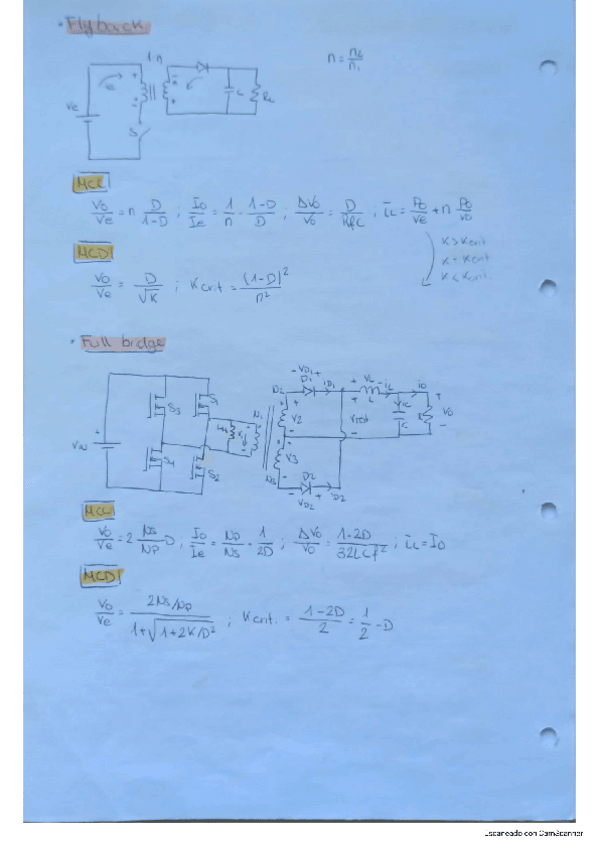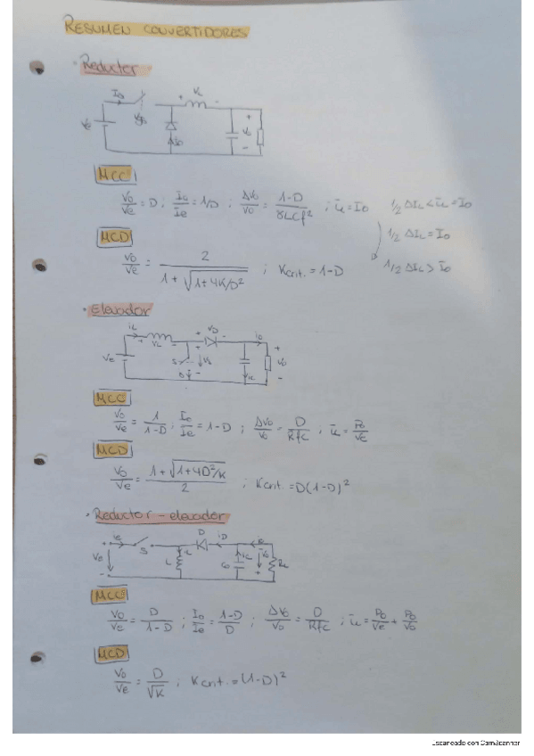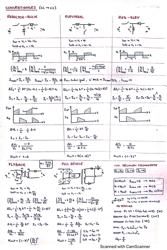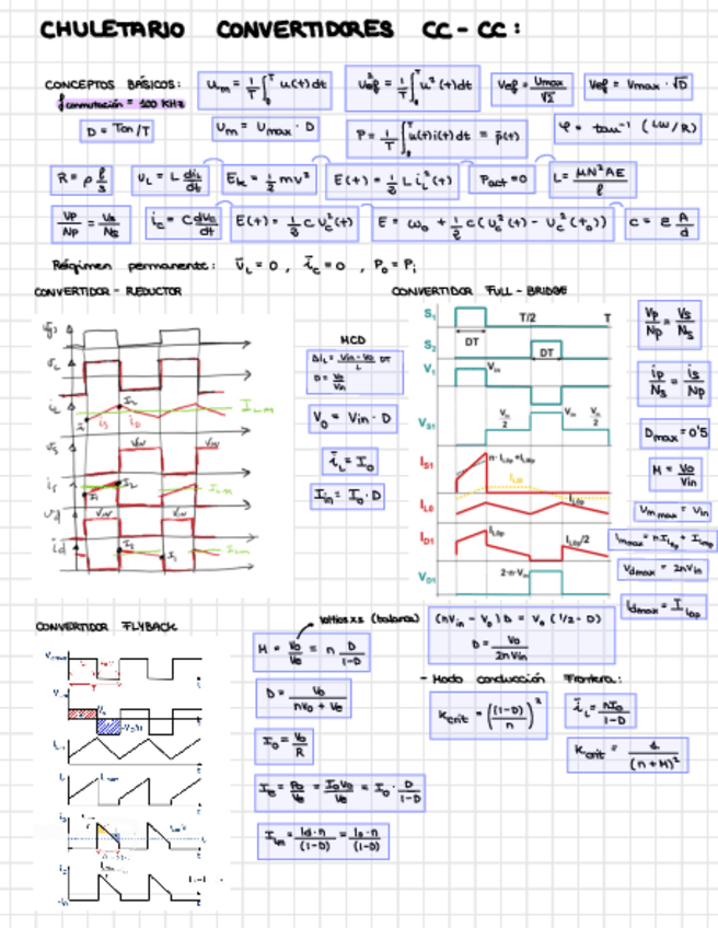 Apuntes de análisis de convertidores; reductor-buck, elevador-boost, reductor-elevador de 4 interruptores, flyback, fullbridge y dual active bridge, en MCD y MCC.