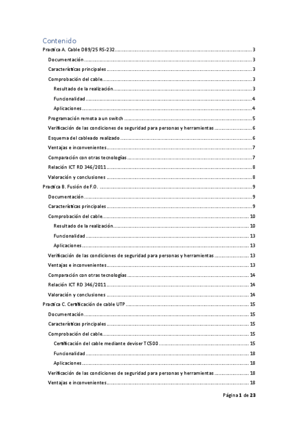 Hay 4 practicas en el documento: Soldado de Cable DB9/25 RS-232, Fusión de fibra óptica, Certificación de cable UTP, Empalme mecánico de fibra óptica