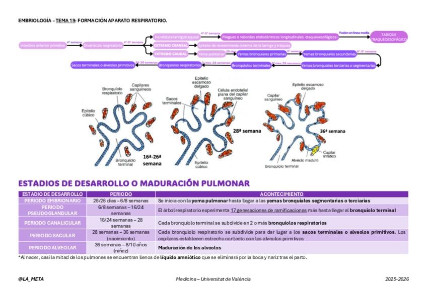 Esquema de resumen y tabla con fotos del Tema 19 de Embriología: Formación del aparato respiratorio.