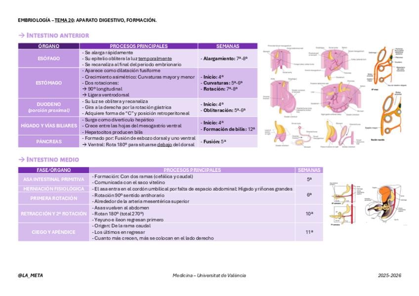 Tablas de resumen con imágenes de todo el Tema 20 de Embriología: Formación del Aparato digestivo.