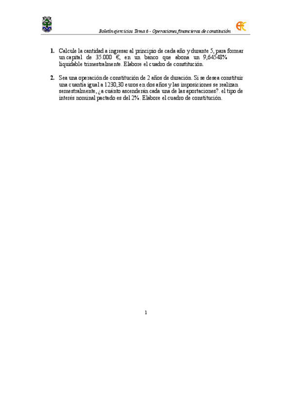 Teoria, ejercicios y su resolucion tema 6 . OPERACIONES FINANCIERAS DE CONSTITUCION