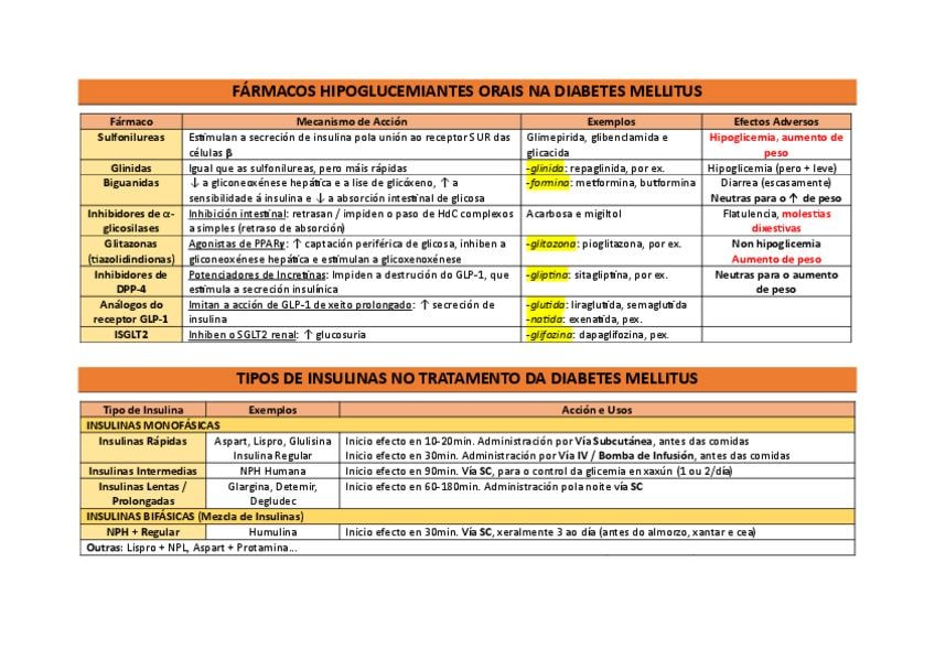 Táboa que recolle os principais hipoglicemiantes orais e os distintos tipos de insulinas para o tratamento da diabetes mellitus Tabla que recoge los principales hipoglucemiantes orales y los distintos tipos de insulinas para el tratamiento de la diabetes