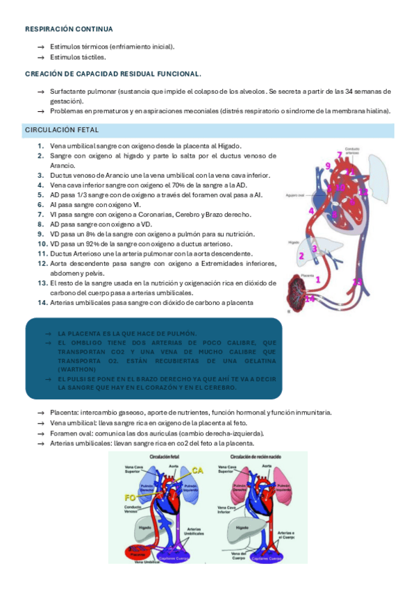 Versión esquemática de la circulación fetal sobre un dibujo, sólo con las palabras clave. Una explicación más detallada en apuntes tema 10