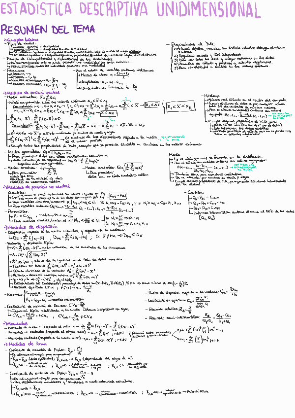 Resumen del tema 1 de estadística. Contiene un resumen de toda la teoría del tema, un recopilatorio con todas las fórmulas y las demostraciones de las fórmulas más importantes.