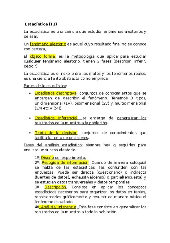 Apuntes de Estadística I, de DADE, con todos los temas, el bloque de Excel y el de cálculo.