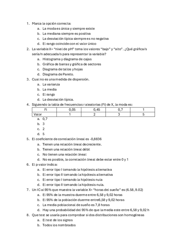 Primer parcial de estadística de 1º de Biología de la Uex, las respuestas no son 100% correctas.