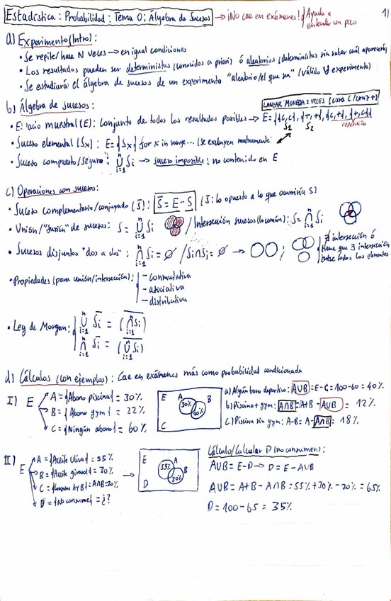 Apuntes (Enfocados en exámenes) PEI 1 Estadística (6 Problemas A-F 1 hora 30 min). Álgebra de Sucesos no entra. 1 Problema Combinatoria/Condicionada, 1 Problema Variable Aleatoria, 3 Problemas Modelos, 1 Problema de PCL. Subiré ejercicios (sobre todo de e
