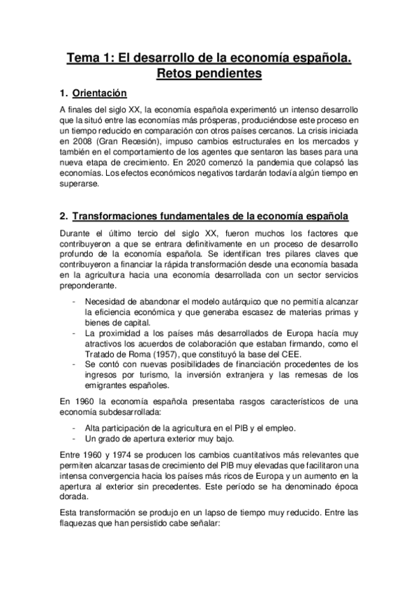 Tema 1 El desarrollo de la economía española. Retos pendientes
