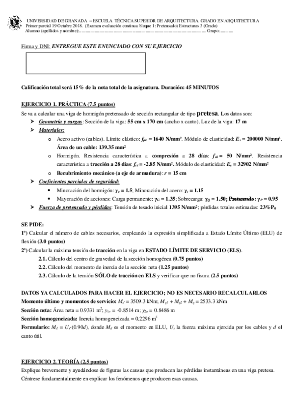He publicado nuevos examenes de 5º Estructuras 3: Diafragmas Horizontales, Pantallas Triangulares y Hormigón Pretensado: ExamenBloque1(resuelto)2018/19.pdf