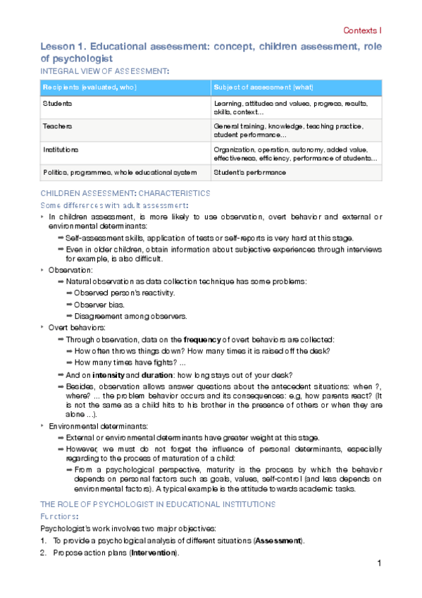 Assessment applied to contexts I