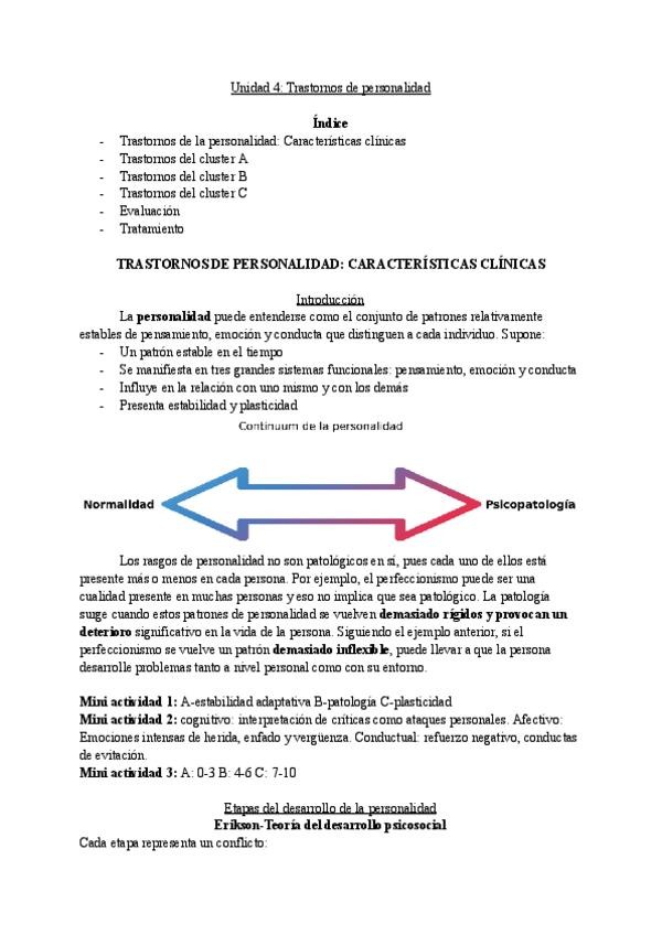 UNIDAD 4. EVALUACIÓN E INTERVENCIÓN PSICOLÓGICA EN TRASTORNOS DE LA PERSONALIDAD EN POBLACIÓN ADULTA Y VEJEZ. Incluye preguntas tipo test realizadas por el profesor en el chat de la clase.