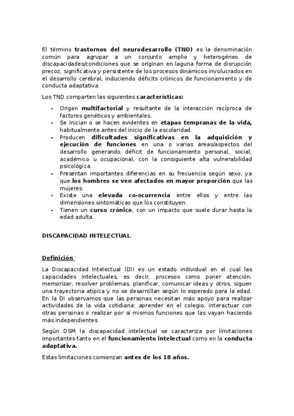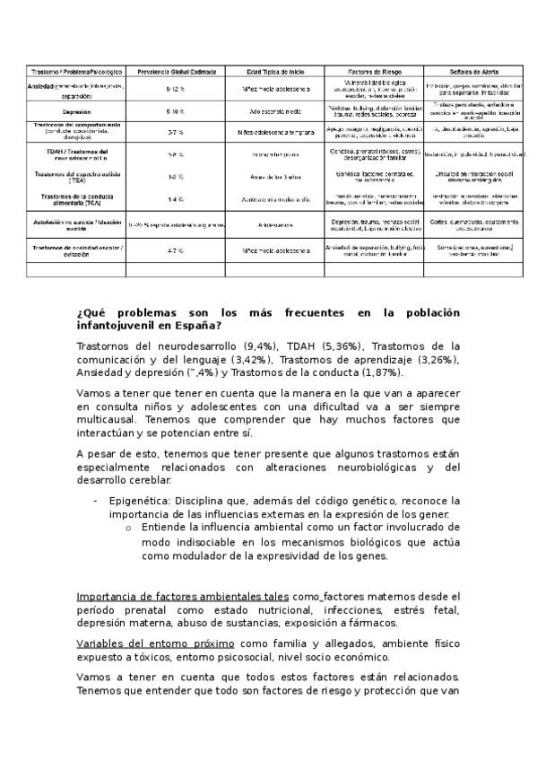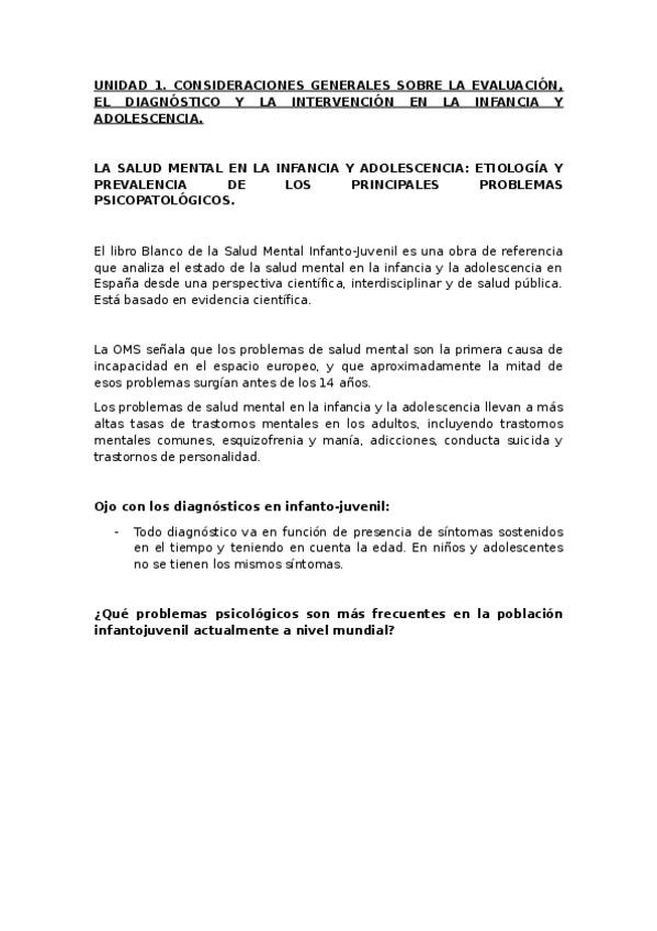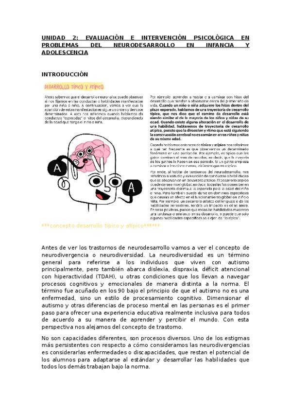 Apuntes redactados de Infancia. UNIDAD 2: EVALUACIÓN E INTERVENCIÓN PSICOLÓGICA EN PROBLEMAS DEL NEURODESARROLLO EN INFANCIA Y ADOLESCENCIA. Con asteriscos y comentarios en otro color en lo enfatizado en las clases de repaso de la unidad.