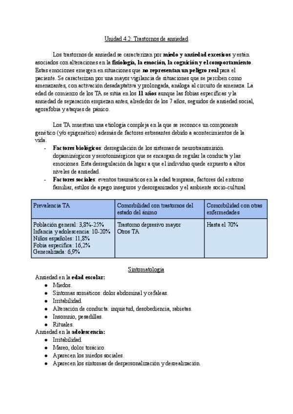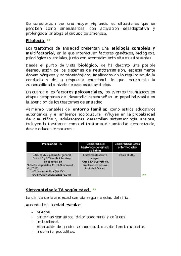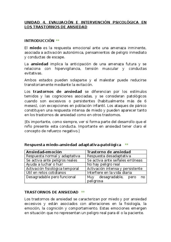 Apuntes redactados de infancia. UNIDAD 4. EVALUACIÓN E INTERVENCIÓN PSICOLÓGICA EN LOS TRASTORNOS DE ANSIEDAD. Incluye asteriscos y comentarios en otro color en lo enfatizado en las clases de repaso. Incluye preguntas tipo test del kahoot y caso clínico e