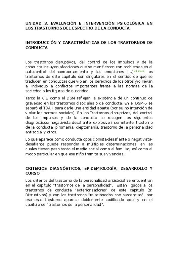 Apuntes redactados Infancia. UNIDAD 3. EVALUACIÓN E INTERVENCIÓN PSICOLÓGICA EN LOS TRASTORNOS DEL ESPECTRO DE LA CONDUCTA. Incluye asteriscos y comentarios en otro color sobre lo enfatizado en las clases de repaso. Incluye caso teórico de ejemplo de exam