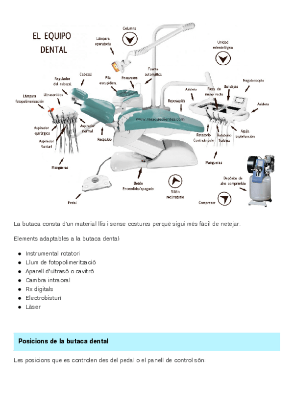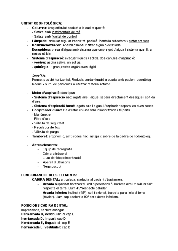 RA1 areas, parts equip dental, unitat del pacient, unitat odontologica, funcionament dels elements, posicions de la cadirainstrumental rotatori, inici jornada, entre pacients i final, criteris qualitat