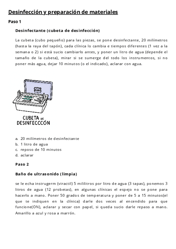 pasos para la desinfección, esterilización y preparación del material y la silla de trabajo.