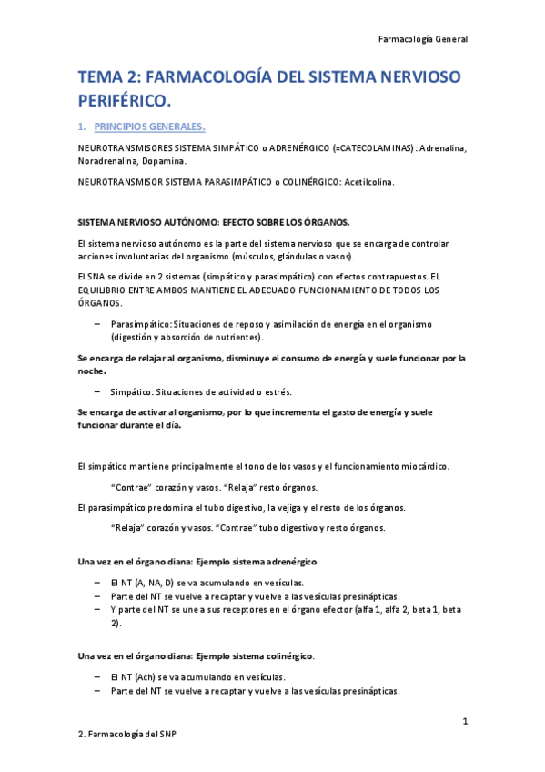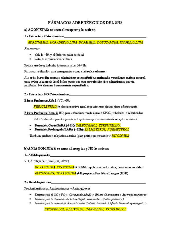 Fármacos del SNS (Adrenérgicos) Fármacos del SNP (Colinérgicos) Fármacos de los Mediadores Celulares (Histamina y Serotonina) Al final hay ejercicios resueltos de interacciones, reacciones adversas y casos clínicos