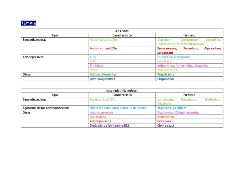 Tablas resumen de los temas de fármacos de farmacología I