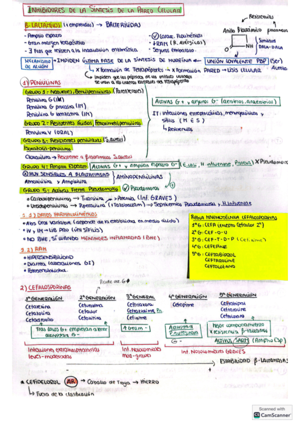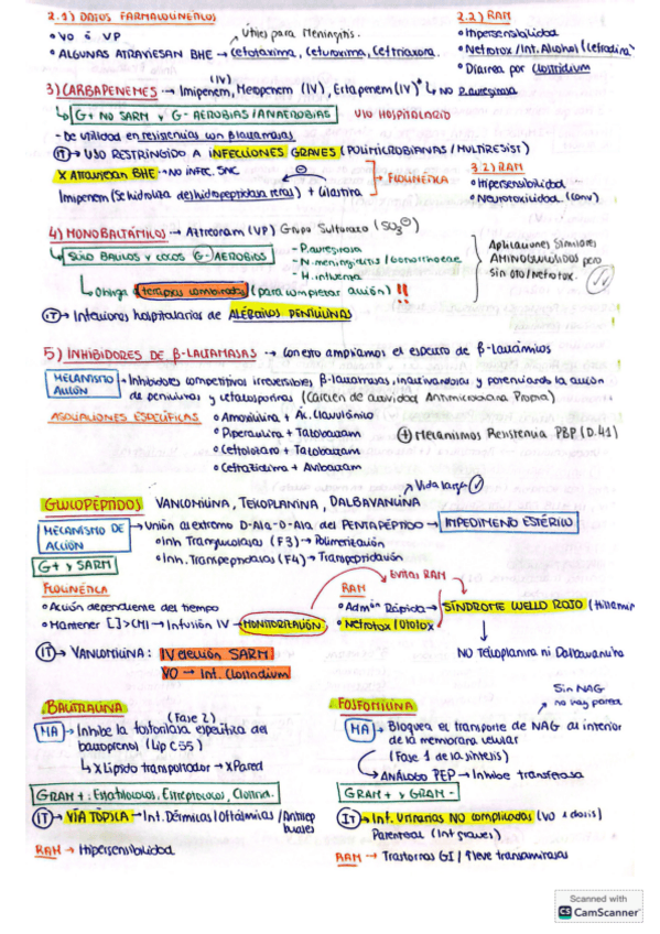En la pagina 5 en indicaciones de Glucopéptidos: - Vancomicina es de elección vía i.v para tratamiento de infecciones producidas por estafilococos (SARM), enterococos y estreptococos y tambien por via oral para colitis pseudomembranosa por C. difficile - Teicoplanina y Dalbavacina = NO producen síndrome de cuello rojo