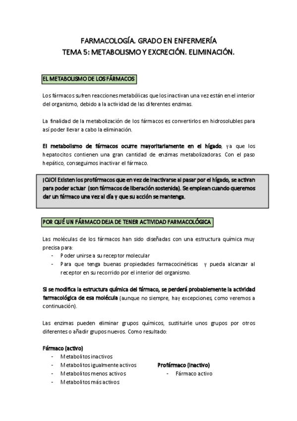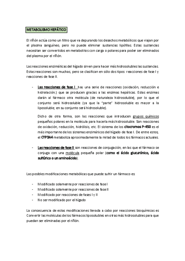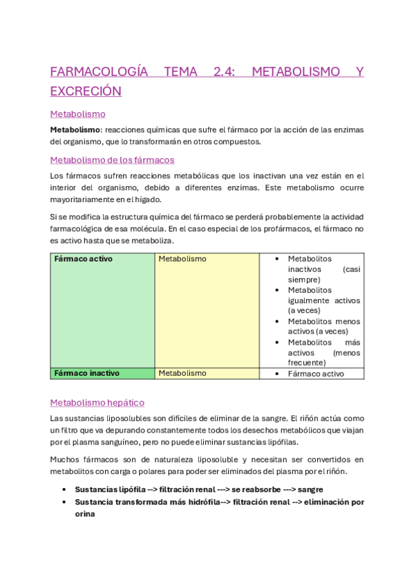 Apuntes tema 2.4 de farmacocinética sobre el metabolismo y la excreción. Con notas de clase y fotos