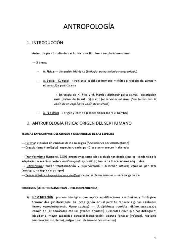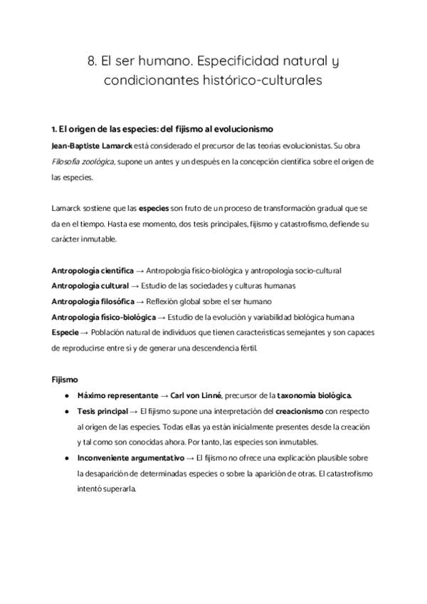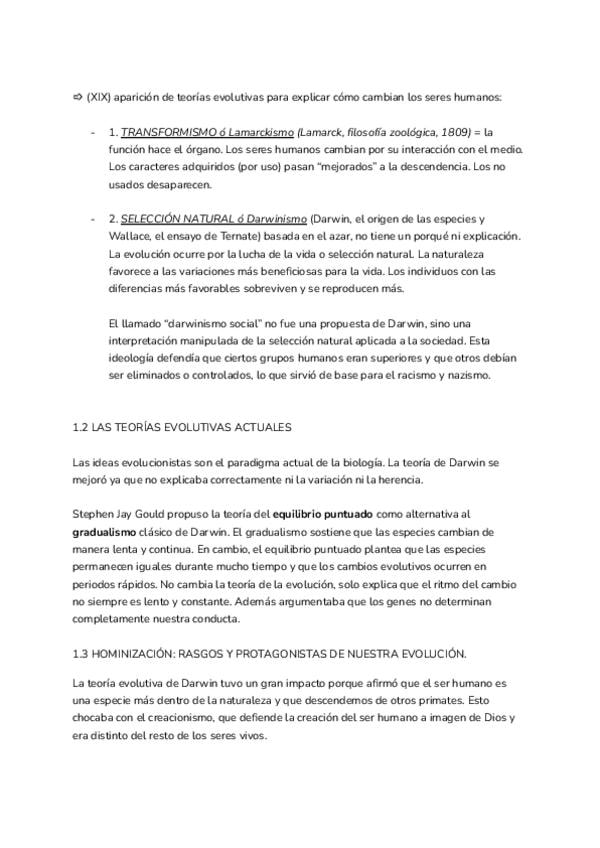 1. El origen de las especies: del fijismo al evolucionismo 2. Darwin y la selección natural 3. Superación del darwinismo: teoría sintética de la evolución 4. El proceso evolutivo en el ser humano: hominización y humanización 5. Identidad humana: naturalez