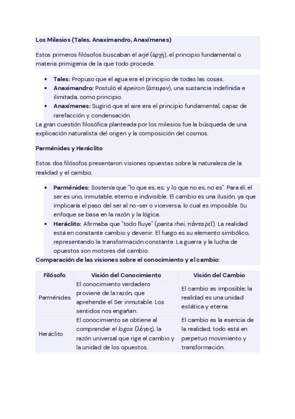 1. Los primeros filósofos 2. La filosofía como paso del mito al logos 3. La filosofía como ejercicio de la racionalidad teórica y práctica 4. Ramas de la filosofía y áreas actuales de investigación 5. Alcance de la filosofía: filosofía, ciencia, religión
