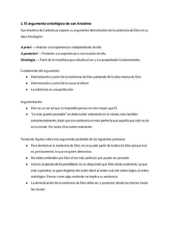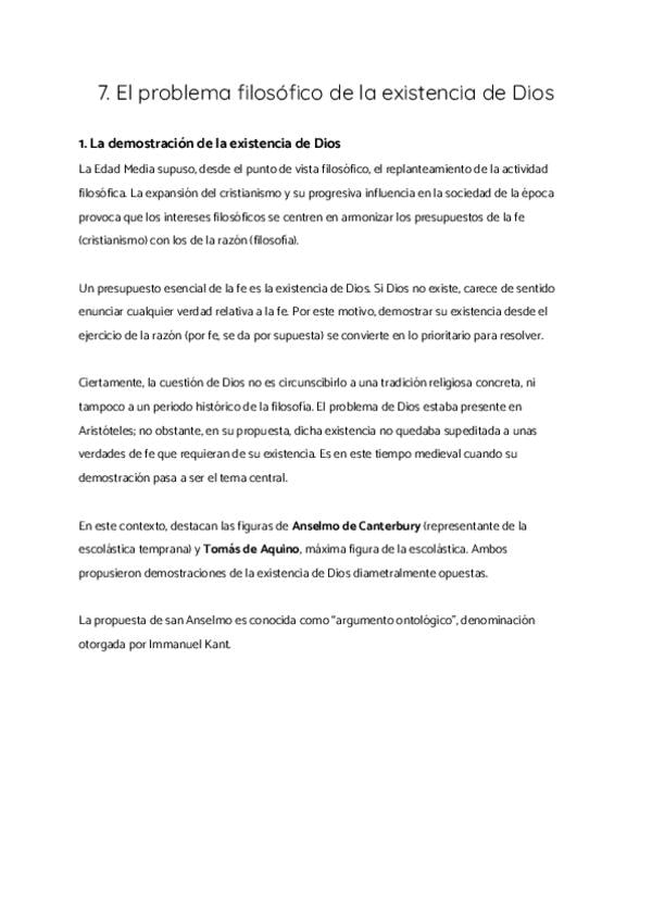 1. La demostración de la existencia de Dios 2. El argumento ontológico de san Anselmo 3. El problema de Dios en Tomás de Aquino 4. Guillermo de Ockham: separación entre fe y razón 5. Dios en la modernidad: Descartes, Hume y Kant. 6. La sospecha sobre Dios