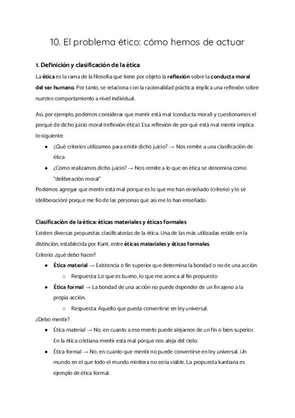 1. Definición y clasificación de la ética 2. Éticas materiales 3. Éticas formales 4. Otras clasificaciones posibles de la ética 5. La deliberación moral 6. Universalismo y relativismo moral 7. Los derechos humanos 8. Grandes problemas éticos de nuestro ti