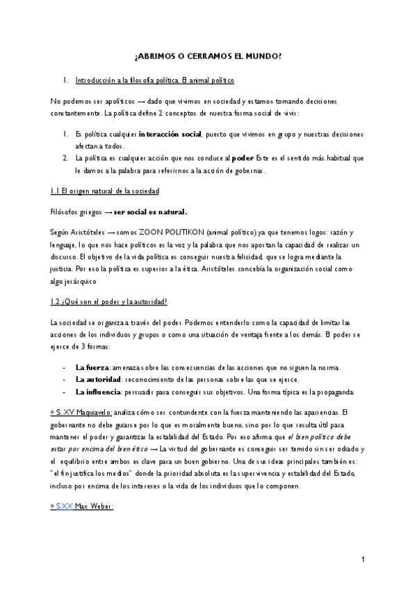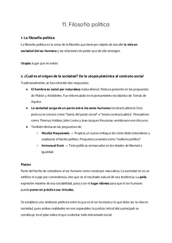 1. La filosofía política 2. ¿Cuál es el origen de la sociedad? De la utopía platónica al contrato social 3. Poder y estado: de súbditos a ciudadanos 4. Debate actual en torno al modelo de estado 5. La reflexión filosófica en torno a la democracia 6. El fe