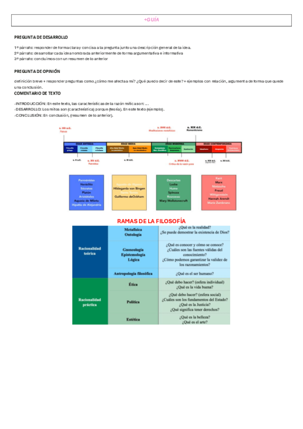 Como responder preguntas de desarrollo, preguntas de opinión y un breve esquema de como realizar el comentario de texto. Incluye la línea del tiempo y las remas de la filosofía.