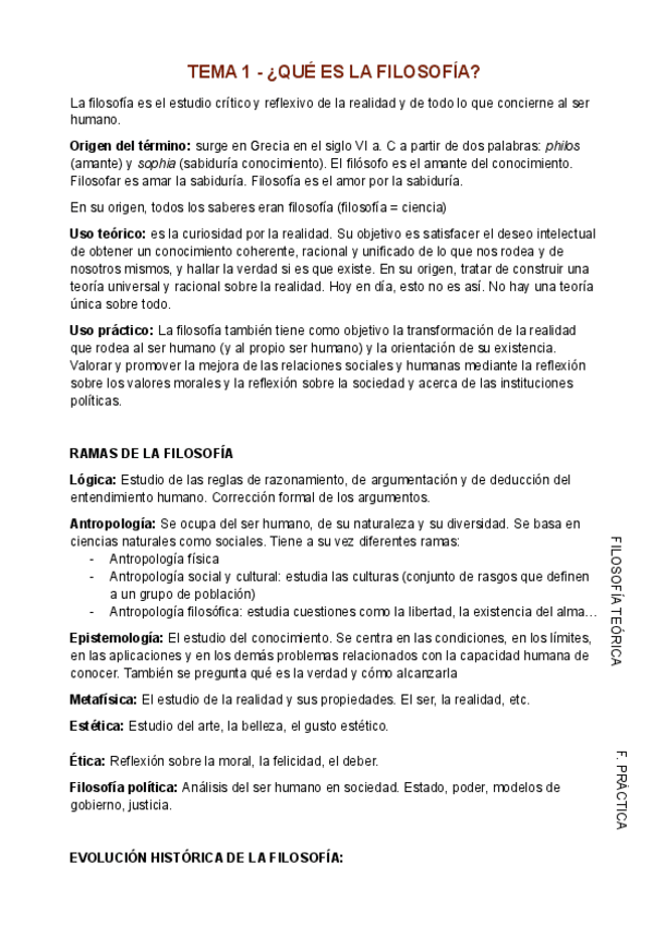 Temario Filosofía 1º Bachillerato (Tema 1) - ¿Qué es la filosofía? Origen del término Uso teórico y práctico Ramas de la filosofía: Lógica, Antropología, Epistemología, Metafísica, Estética, Ética, Filosofía política Evolución histórica de la filosofía