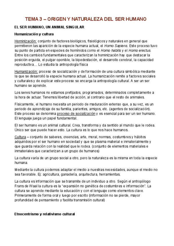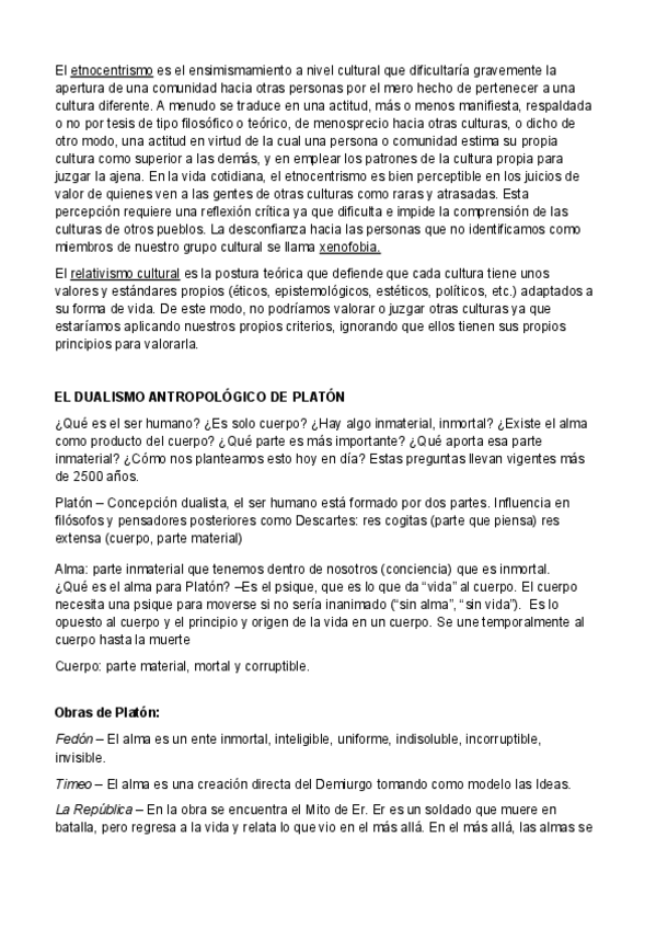 Temario Filosofía 1º Bachillerato (Tema 3) - Origen y naturaleza del ser humano El ser humano, un animal singular Humanización y cultura Etnocentrismo y relativismo cultural El dualismo antropológico de Platón: Obras de Platón (Fedón, Timeo, La Repúblic