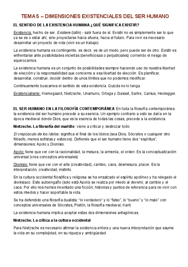 Temario Filosofía 1º Bachillerato (Tema 5) - Dimensiones existenciales del ser humano El sentido de la existencia humana El ser humano en la filosofía contemporánea: Nietzsche (filosofía del martillo, crítica a la cultura occidental, nihilismo, voluntad