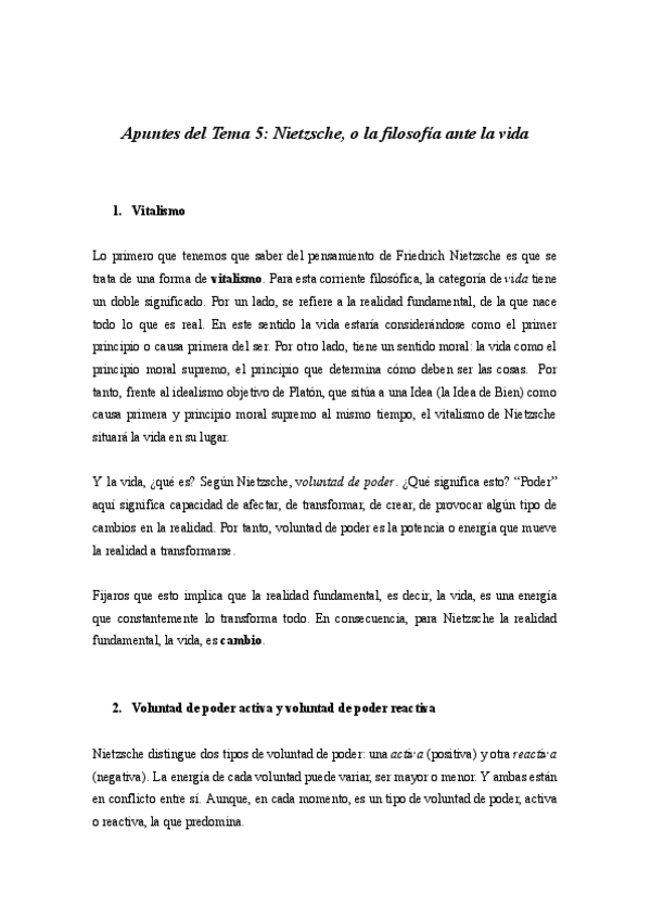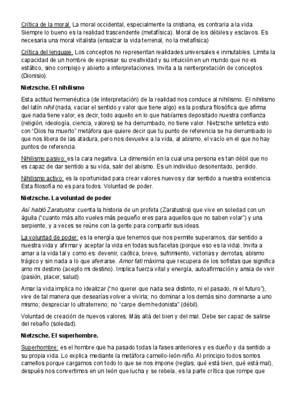 Apuntes claros y completos sobre el pensamiento de Nietzsche para 1º de Bachillerato: superhombre, muerte de Dios, nihilismo, moral de esclavos, crítica al Estado y a la religión, y la importancia del arte y la vida. Incluye definiciones, explicaciones se
