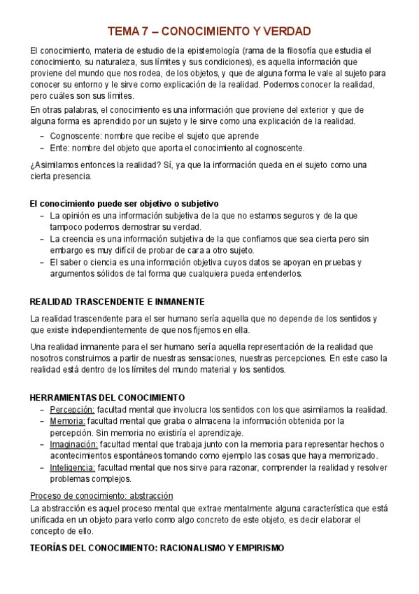 Temario Filosofía 1º Bachillerato (Tema 7) - Conocimiento y verdad Realidad trascendente e inmanente Herramientas del conocimiento Proceso de conocimiento: abstracción Teorías del conocimiento: Racionalismo (Descartes), Empirismo (Hume), Trascendentalis