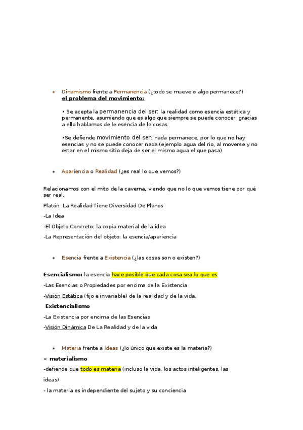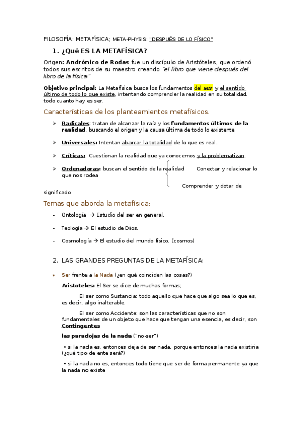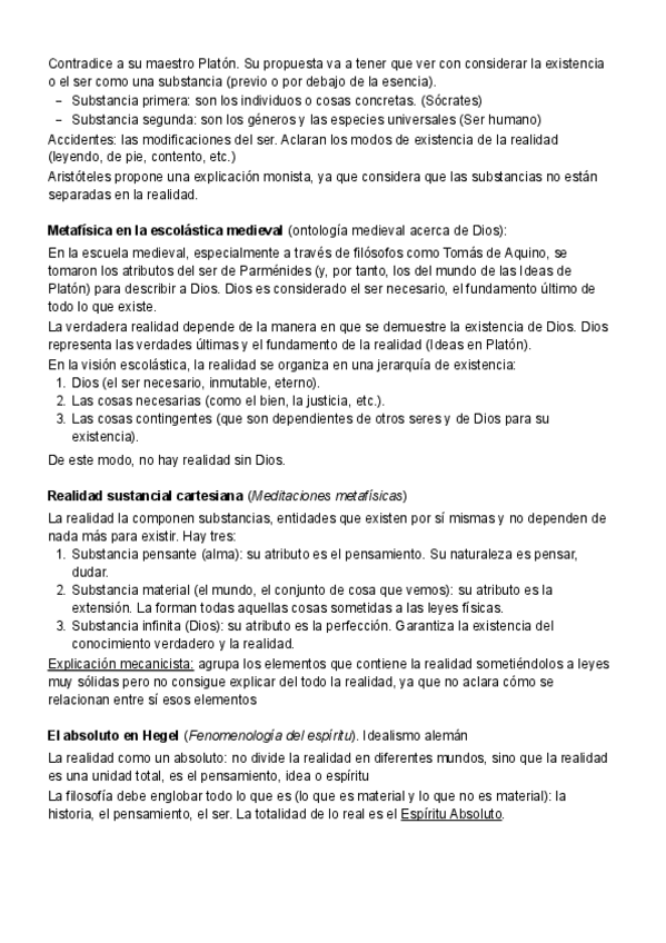 Temario Filosofía 1º Bachillerato (Tema 8) - La realidad y el ser Metafísica Teorías acerca de la realidad: Parménides y las primeras nociones del ser, División del mundo en Platón (idealismo platónico), Metafísica de Aristóteles, Metafísica en la escolá