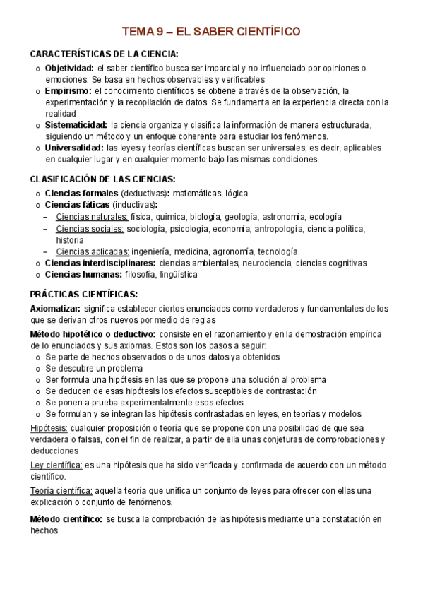 Temario Filosofía 1º Bachillerato (Tema 9) - El saber científico Características de la ciencia Clasificación de las ciencias Prácticas científicas Método científico Karl Popper: criterio de falsación Thomas Kuhn: paradigmas y revoluciones científicas