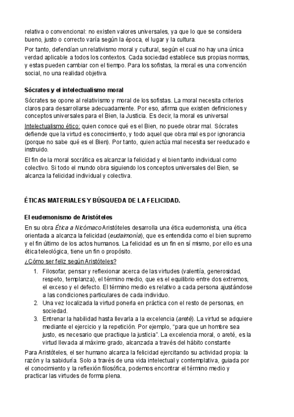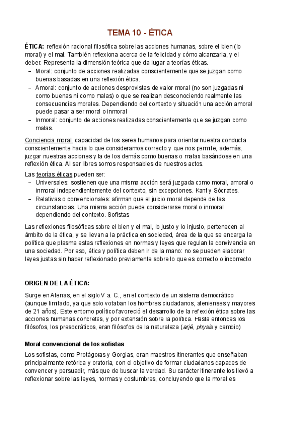 Temario Filosofía 1º Bachillerato (Tema 10) - Ética Origen de la ética Moral convencional de los sofistas Sócrates y el intelectualismo moral Éticas materiales y búsqueda de la felicidad: El eudemonismo de Aristóteles, El hedonismo de Epicuro, El estoic