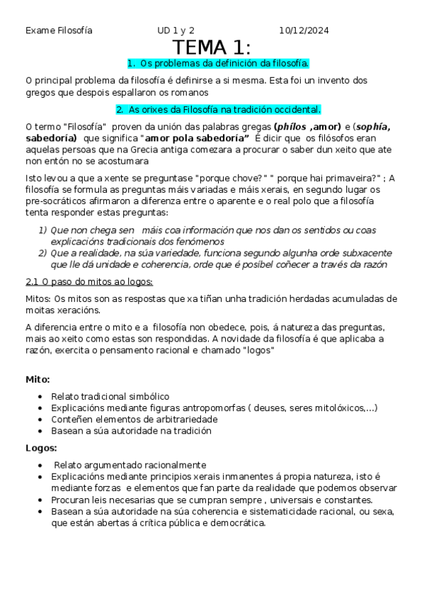 Tema 1: La Definición, Origen e Historia de la Filosofía Los Problemas de la Definición de la Filosofía. Orígenes de la Filosofía en la Tradición Occidental. El Paso del Mito al Logos. Características de la Filosofía (Racional, Argumentativa, Crítica,